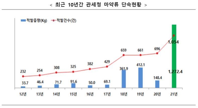 2020년 관세청 마약류 단속실적은 696건으로, 148kg에 달했지만, 2021년엔 총 1054건으로 1272kg가 적발된 것이다. 약 1124kg가 증가한 셈이다.
