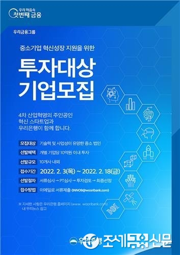 (조세금융신문=최주현 기자) 우리은행은 오는 3일부터 18일까지 '제9차 중소기업 성장 지원을 위한 투자대상 기업 공모'를 실시한다.