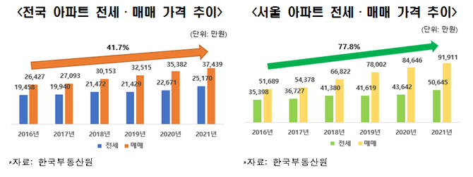 이 가운데 전국 아파트중위매매가격은 2016년 2억6000만원에서 2021년 3억7000만원으로 41.7%나 증가했고, 같은 기간 전세가격은 1억9000만원에서 2억5000만원으로 29.4% 올랐다.