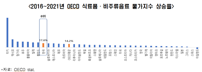 한경연 측이 5년간(2016~2021년) OECD 식료품 및 비주류 음료 물가지수 데이터를 분석한 결과, 한국의 상승률은 17.6%로 37개국 중 8위, OECD 평균 상승률보다 3.4%p 높았다. 2021년 한국의 식료품·비주류음료 물가상승률은 5.9%로 OECD 3위에 달했다.