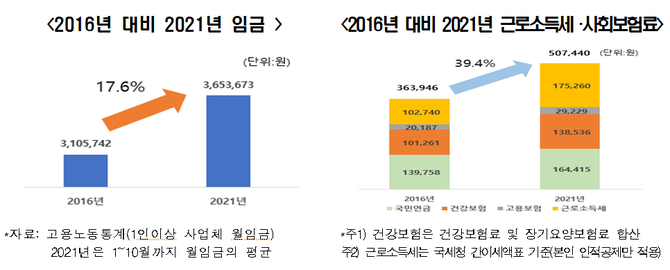 1인 이상 사업체 소속 근로자의 평균 월급은 2016년 310.5만원에서 2021년 365.3만원으로 54.8만원(증가율 17.6%) 올랐다, 같은 기간 근로소득세 및 사회보험료 부담은 36.3만원에서 50.7만원으로 14.4만원 늘었으나 증가율은 39.4%로 월급상승률의 두 배에 달했다.