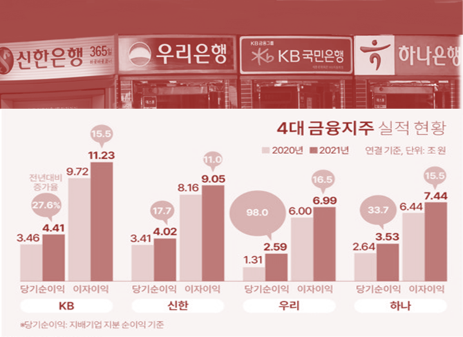 KB금융그룹의 이자이익(11조2천296억원)이 15.50%나 불어 유례없이 10조원을 넘어섰고, 하나금융그룹의 이자이익(7조4천372억원)도 15.49%나 증가했다.