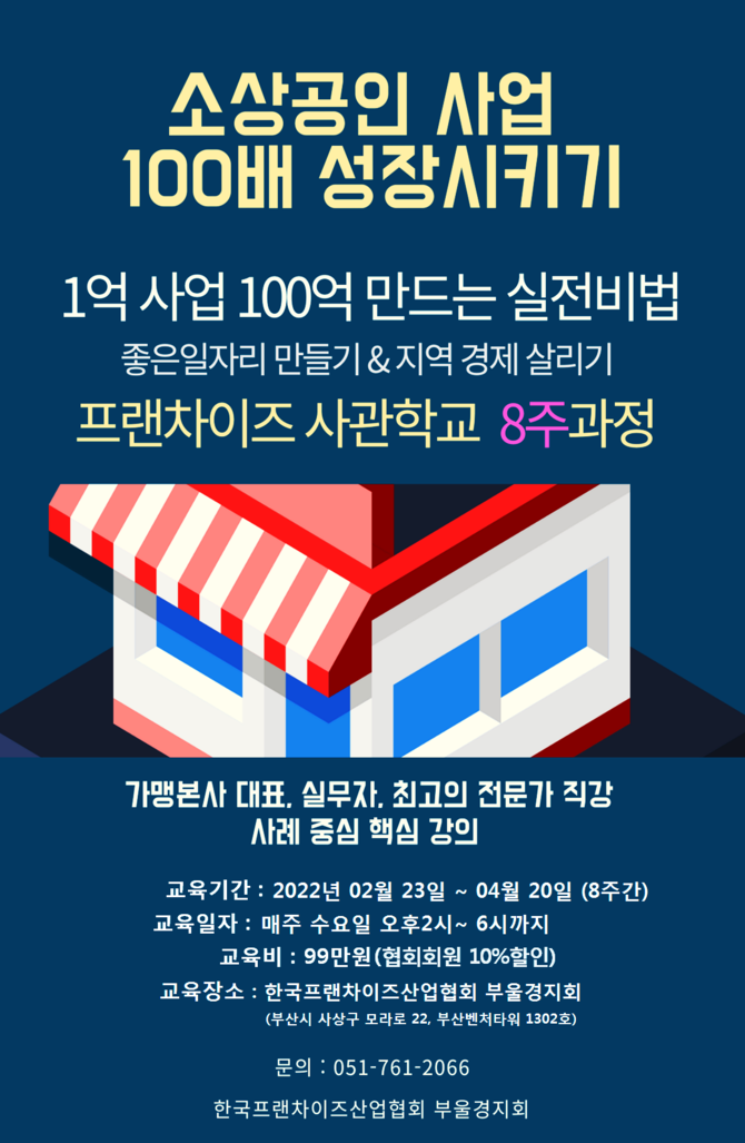 한국프랜차이즈산업협회 부울경 지회 남구만 회장은 ‘코로나로 어려운 시기였음에도 지난해 하반기에 진행됐던 1기 교육에 신청자가 쇄도했다. 뜨거운 반응은 부울경 지역 소상공인들의 성장에 대한 열정을 보여준다‘며 ’2기 교육도 사전 신청이 많은 것은 1기 교육의 만족도가 높았기 때문‘이라고 말했다.