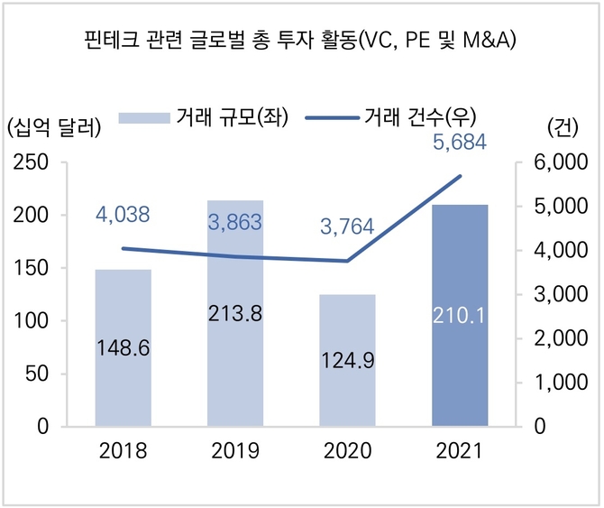 핀테크 M&A 거래액은 2020년 758억 달러에서 2021년 831억 달러로 늘었다. 핀테크 분야 크로스보더 M&A 거래액은 362억 달러로 전년 대비 3배 이상 상승했다.