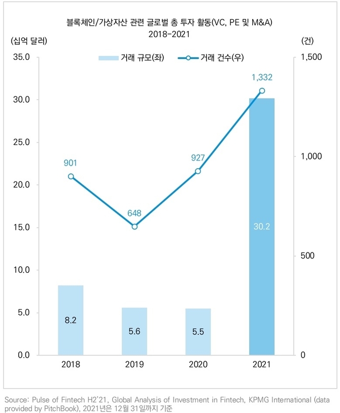 블록체인 및 가상자산(302억 달러), 사이버보안(48억 달러), 자산관리(16억 달러) 분야는 사상 최대 투자액을 유치했다. 블록체인 및 가상자산 기술 부문은 2020년 55억 달러에서 무려 449% 급증하는 초강세를 기록했다. 같은 기간 투자 건수는 927건에서 1332건으로 43% 늘었다.