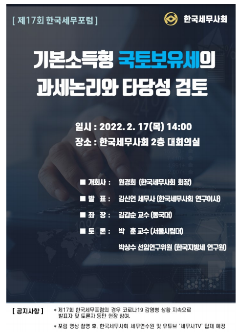(조세금융신문=고승주 기자) 한국세무사회는 17일 오후 2시 한국세무사회관 2층 대회의실에서 제17회 한국세무포럼을 열고 기본소득형 국토보유세의 타당성에 대해 논의한다.