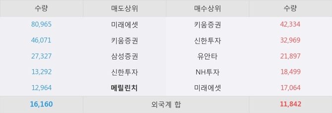 거래원 동향은 메릴린치, 미래에셋, 삼성증권 등이 매도 상위 목록에 나타나고 있다.