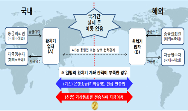 가상자산을 이용한 신종 환치기 수법으로 8238억원 상당이 적발됐다. 가상자산을 이용한 신종환치기는 국가 간 실제 자금의 이동은 없다는 점에서 기존 환치기 수법과 동일하지만, 가상자산의 국가 간 이동이 발생한다는 점에서는 기존 환치기 수법과 차이가 있다.