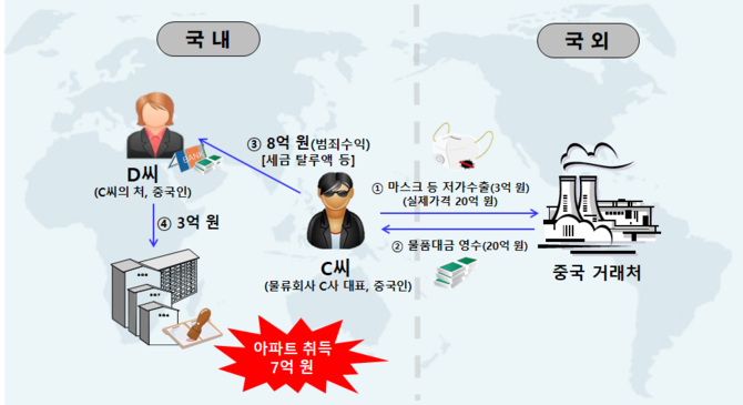 C사(대표 중국인)는 마스크, 국산 방호복 등을 중국에 수출하면서 세관에 물품가격을 저가로 신고해 매출을 축소하는 방법으로 8억원 상당 소득세를 포탈했다.