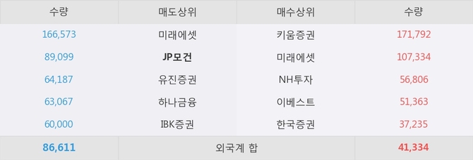 거래원 동향은 JP모건, 미래에셋, 하나금융 등이 매도 상위 목록에 나타나고 있다.