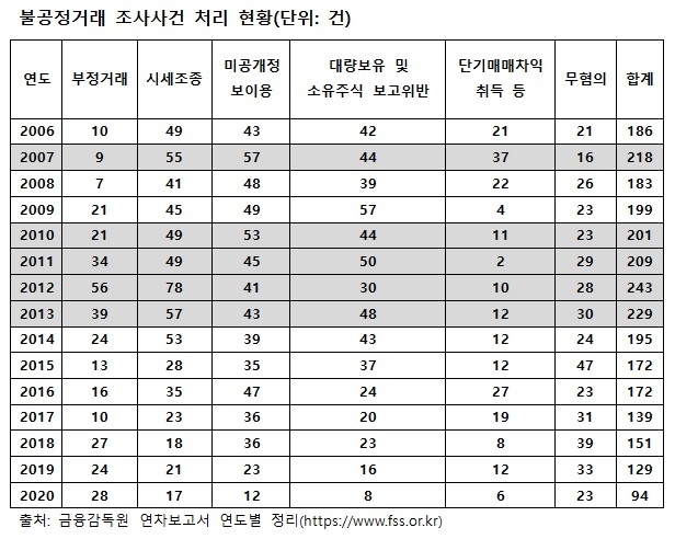 불공정거래 사건의 처리 현황은 보통 처리율이 절반 수준에 머물고 있다. 자본시장법 위반 사건의 처리율이 다른 사건의 처리율보다 낮고, 법원의 판결도 집행유예 비율이 높다. 불공정거래 사건에 대한 강력한 처벌이 이루어지지 않고 있다.
