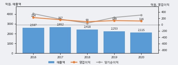 최근 3년간의 실적을 살펴보면, 매출액은 3년 연속 하락하고 있으나 그 하락폭은 줄어들고 있음을 알 수 있다.