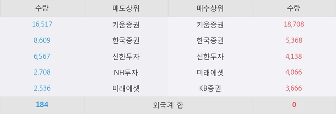이 시각 주요 거래원은 미래에셋, 키움증권, 한국증권 등이 매수 상위 창구에 자리하고 있다.