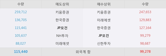 거래원 동향은 JP모건, 미래에셋이 매수 상위 목록에 나타나고 있다. 한편, 매도 창구 상위에는 JP모건이 눈에 띄고 있다.