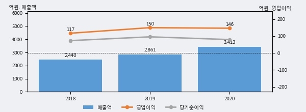 최근 실적을 살펴보면 2020년 매출액이 최근 3년 중 가장 높은 실적을 기록했음을 알 수 있다. 이전 최고 실적이었던 2019년 보다도 19.3%(552억 2천만원) 늘어난 것으로 나타났다.