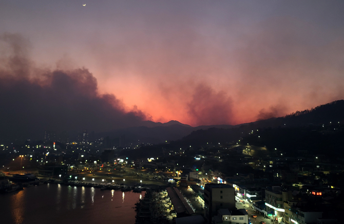 날이 저물자 헬기를 모두 철수시키고, 진화차 등 장비와 인력 수천 명을 동원해 곳곳에 방어선을 구축하고 있다.