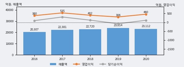 풀무원의 2020년 매출액은 전년대비 -2.9% 줄어든 2조 3112억원이고, 영업이익은 전년대비 50.4% 늘어난 460억원을 기록했다. 이 회사의 매출액 증감률과 영업이익 증감률은 각각 코스피 하위 50%, 상위 26%에 해당된다.