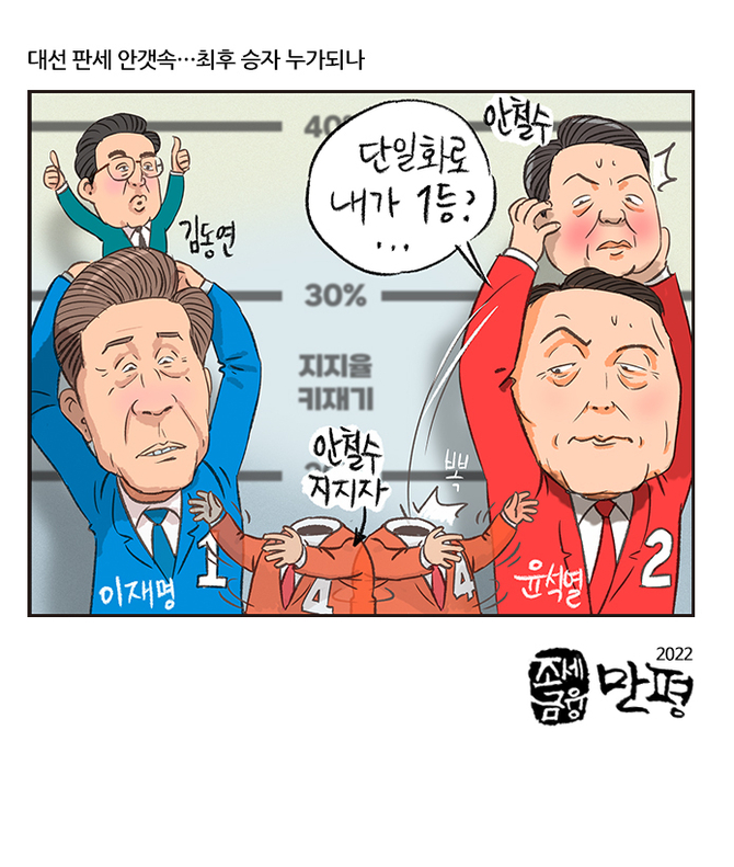 [조세금융만평] 대선 D-2 박빙판세…“승기 잡았다” vs “역전 노린다”