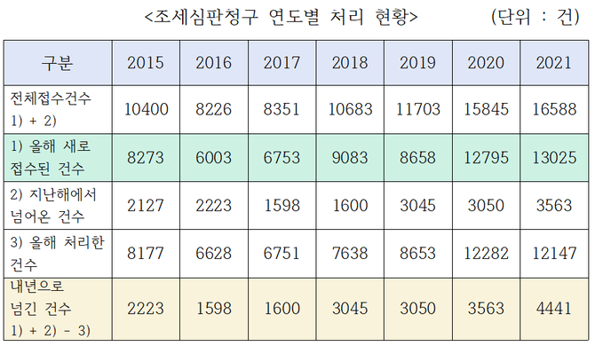 조세심판원이 23일 공개한 2021 조세통계연보에 따르면 올해 다 처리하지 못해 다음해로 넘긴 조세불복사건 건수(이월건수)는 2021년 4441건으로 2020년보다 24.6%나 증가했다.