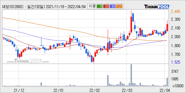 대창은 2021년 매출액 1조 2776억원과 영업이익 603억원을 기록했다. 전년대비 매출은 36.9%, 영업이익은 112.7% 각각 상승했다. 이 회사의 매출액 증감률과 영업이익 증감률은 각각 코스피 상위 15%, 상위 25%에 해당된다.