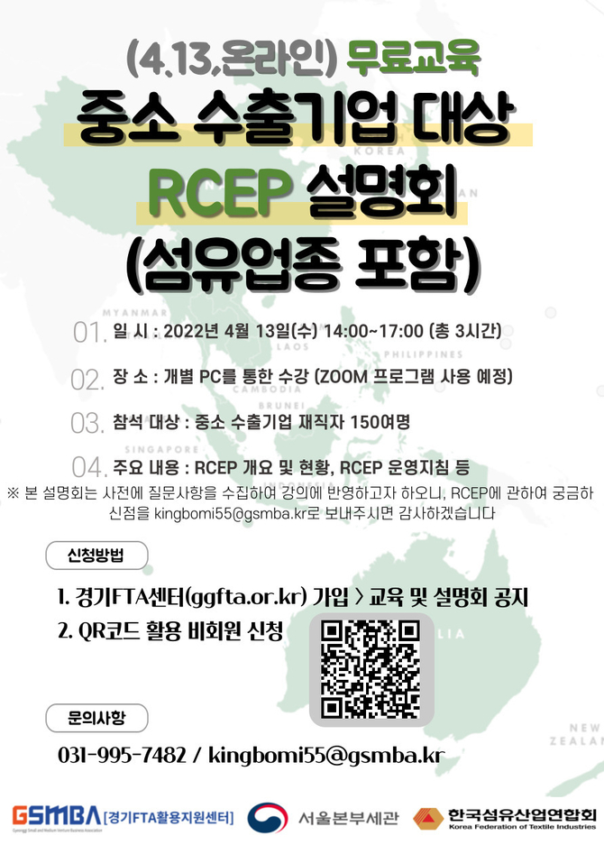 먼저, 서울본부세관은 경기FTA활용지원센터와 한국섬유산업협회 공동주관으로 중소 수출기업의 RCEP 활용지원을 위해 4월 13일(수) 14시 ‘온라인 RCEP 활용 설명회’를 개최한다.