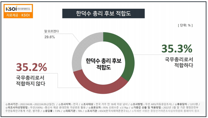 ‘국무총리로서 적합하다’는 의견이 35.3%, ‘적합하지 않다’는 의견이 35.2%로 팽팽했으며, ‘잘 모르겠다’는 응답도 29.6%나 나왔다.
