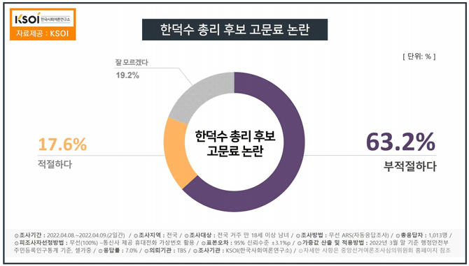 한국사회여론연구소(KSOI)가 TBS 의뢰를 받아 지난 8~9일 전국 만 18세 이상 유권자 1013명을 대상으로 조사한 결과, 한 후보자의 20억 고문료 관행 관련 ‘부적절하다’는 응답(63.2%)이 ‘적절하다’는 응답(17.6%)보다 압도적으로 높은 것으로 나타났다.
