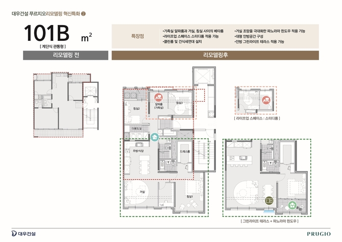 대우건설은 특화 평면 외에도 증축형 리모델링 단지는 상품성이 떨어진다는 편견을 깨기 위해 상품구성 가이드라인도 마련했다. 세대 내부 전(全)실 우물천정을 적용해 리모델링 후에도 천정 높이가 줄어들지 않도록 설계해 구조적인 문제점을 해결했으며, 커튼월 룩을 비롯한 외관디자인과 스카이 커뮤니티 등 신축 푸르지오 단지와 다름없는 설계 기준을 정립했다.