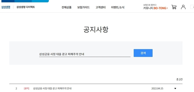 17일 금융권에 따르면 삼성생명과 삼성화재, 삼성카드, 삼성증권은 최근 자사 홈페이지에 '삼성금융 사칭 대출 광고 피해 주의 안내'를 게재하고, "최근 삼성금융을 사칭한 대출 광고 전화가 늘고 있다"면서 "삼성금융은 절대 대출 광고 전화를 하지 않으며 우리와는 무관하다"고 밝혔다.