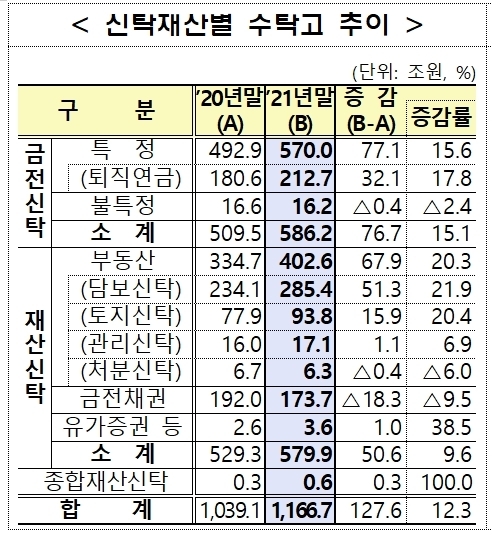 18일 금융감독원이 발표한 ‘2021년 영업 현황 분석’에 따르면 지난해 말 60개 신탁회사의 총 수탁고는 1166조7000억원으로 전년도와 비교해 127조6000억원(12.3%) 증가한 것으로 확인됐다.