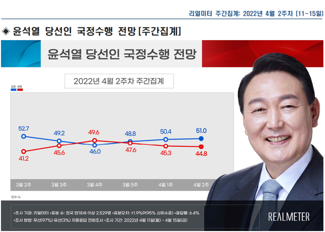 윤석열 정부가 저조한 응답률 속 지지율은 40~50%대에 갖혔다.