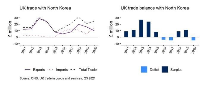 지난해 두 나라 간 교역에서 영국의 대북 수출액은 2천200만 파운드(약 350억원)였고, 대북 수입액은 2천700만 파운드(약 430억원) 규모였다.