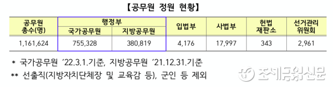 2022년 3월 1일 기준 국가공무원은 77만5328명, 2021년 12월 31일 기준 지방공무원은 38만819명이다. 지방자치단체장 및 교육감처럼 선출직과 군인은 제외한 수치다.