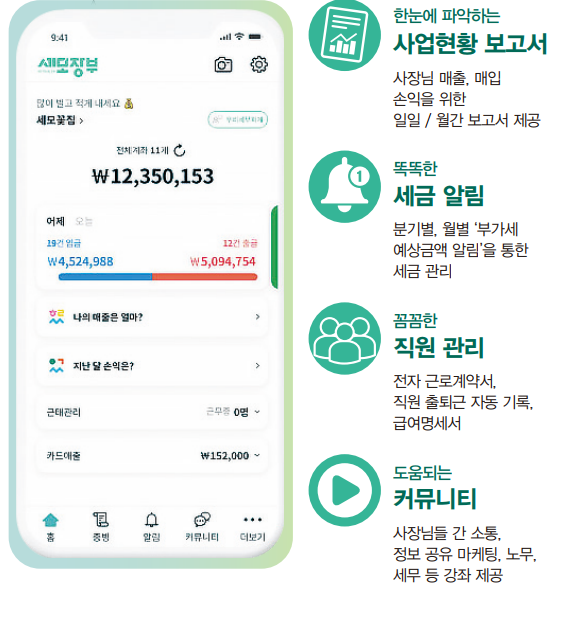 세모장부는 개인사업자 전용 경영관리 종합 플랫폼이다. 매출/매입 데이터 조회뿐만 아니라 전자근로계약서/급여명세서를 통한 직원 관리 등 개인사업자의 전반적인 경영 활동을 지원한다. 특히, 세금 신고에 활용되는 증빙자료를 누락 없이 자동으로 수집하여 절세 효과를 누릴 수 있는 것이 장점이다.