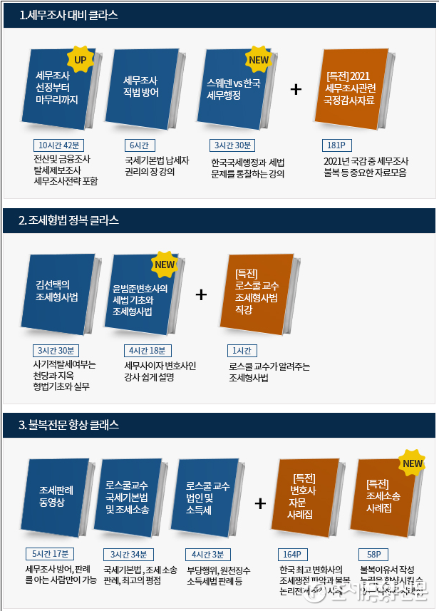 납세자연맹은 세무사는 물론 세무사 사무소 직원 교육용으로 추천할만한 동영상 패키지를 제작했다. 직원교육용 패키지는 총 20시간 12분짜리 ‘세무조사대비 클라스’가 대표적이다. 이 동영상 교재에는 △조사단계별 세무조사 모든 것 △세무조사의 방법 △탈세제보 세무조사 △성공적인 세무조사 전략 △세무조사와 적법절차 △스웨덴 vs 한국의 세무행정 등이 담겼다.