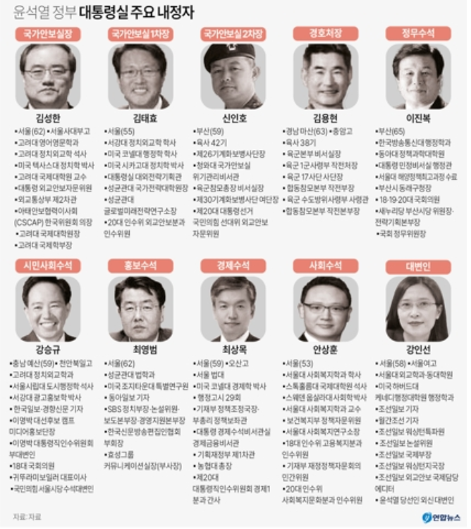 1일 발표된 대통령실의 실장·수석·비서관급 인선 대상자 10명 중 8명이 캠프·인수위를 거쳤다. 이중 상당수는 이명박(MB) 전 대통령 정부·청와대 출신이 다수 포함됐다.