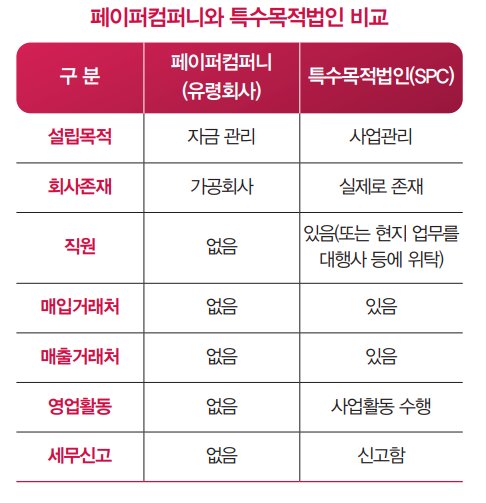 외환 검사 및 조사 실무에서는 해외직접투자신고를 하지 않은 특수목적법인(SPC)과 페이퍼컴퍼니를 구분하지 않고 모두 페이퍼컴퍼니(또는 유령회사)로 분류하여 처리하는 경향이 있으나 이 같은 처리가 정확한 것은 아니다. 해외직접투자 신고를 한 특수목적법인과 페이퍼컴퍼니(유령회사)를 비교하여 본다.