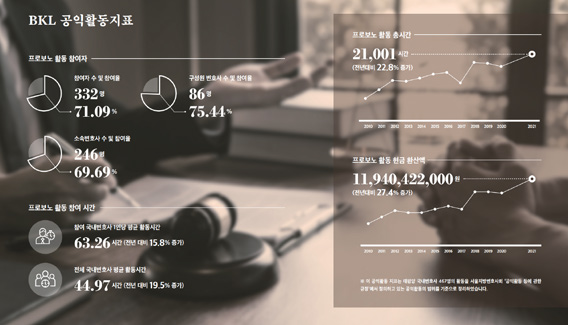 2021년 태평양 변호사들의 하루는 2020년보다도 숨 가빴다. 지난해 공익활동 참가자 수는 332명, 전체 구성원의 열 중 일곱(71%)이 참여했으며, 이들의 공익변호 활동시간을 합치면 무려 2만 1001시간에 달했다. 활동시간은 2020년보다 22.8%나 늘었다. 공익변호 활동을 수임료 등으로 환산해보니 119억 4000만원에 달했다. 이 또한 2020년보다 27.4% 나 늘어난 수치다. 변호사회가 고시하는 기본 금액으로 계산했는데 태평양의 이름값을 포함하면 그 가치는 훨씬 값지다.