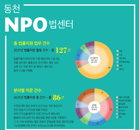 비영리 단체(Non-profit organization)를 지원하는 동천NPO법센터는 공익활동을 요구하는 지역 변호사에게 NPO법률지원단 교육을 제공하고, 교육 수료 후에는 법률지원이 필요한 NPO와 연결해줘 공익 법률활동의 지원자이자 매개자로 활동하고 있다. NPO 활동가들에게는 사회복지사업과 기부금 관련된 법 지식 전달 및 운영전문가과정까지 온라인 워크숍을 통해 안정적인 단체 운용을 돕고 있다.