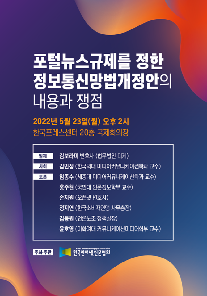 김보라미 변호사가 ‘포털뉴스규제를 정한 정보통신망법개정안의 내용과 쟁점’을 주제로 발제를 하며, 김민정 한국외대 미디어커뮤니케이션학부 교수의 사회로 △임종수 세종대 미디어커뮤니케이션학과 교수 △홍주현 국민대 언론정보학부 교수 △손지원 오픈넷 변호사 △정지연 한국소비자연맹 사무총장 △김동원 언론노조 정책실장 △윤호영 이화여대 커뮤니케이션미디어학부 교수가 토론을 진행할 예정이다.