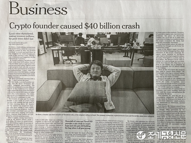 <뉴욕타임즈(NYT)>는 테라 사태가 도미노 효과를 일으켜 비트코인 등 암호화폐 시장가격까지 폭락시킨 권 대표에게 ‘입이 더러운 기업가(trash-talking entreprreneur)’라고 표현했다.