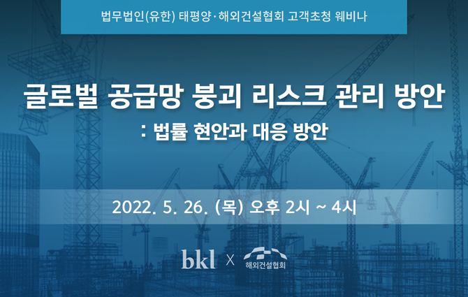 (조세금융신문=고승주 기자) 법무법인 태평양(대표 변호사 서동우)이 오는 26일 오후 2시 글로벌 공급망 위기에 빠진 건설업의 해법을 모색하는 웨비나(웹 세미나)를 개최한다.