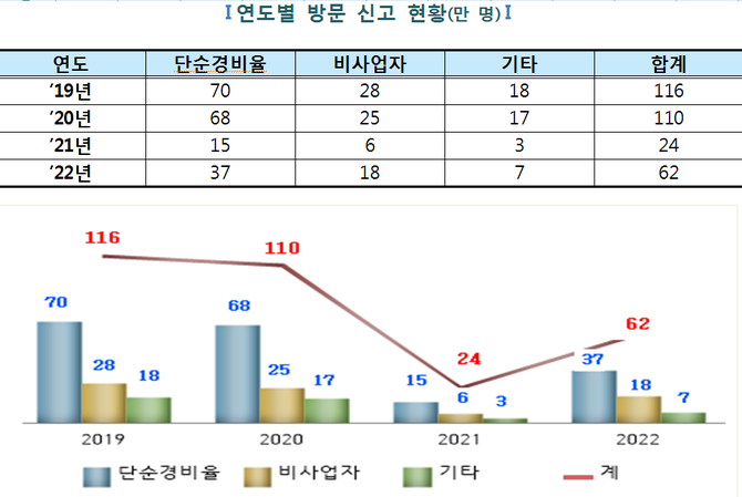 국세청은 2일 5월 종합소득세 신고 관련 세무서 방문신고 인원이 2020년 110만명에서 62만명으로 44%(48만명)이 줄었다고 밝혔다.
