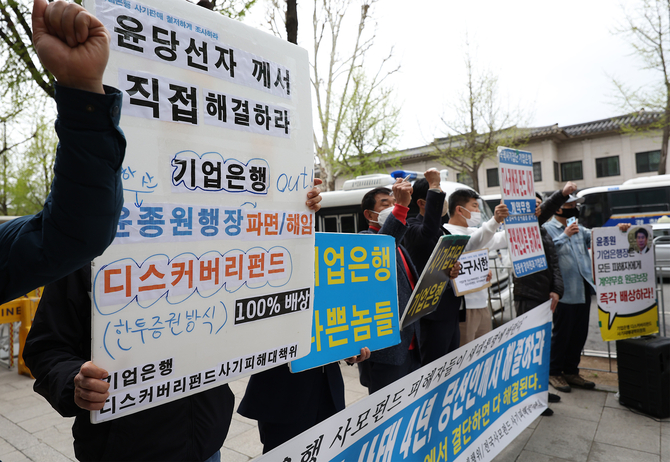 디스커버리펀드는 2017∼2019년 4월 사이 기업은행과 하나은행 등 시중은행과 증권사를 통해 판매된 이후 운용사의 불완전 판매와 부실 운용 등 문제로 환매가 중단돼 개인·법인 투자자들이 막대한 피해를 봤다. 지난해 4월 말 기준 환매 중단으로 은행 등이 상환하지 못한 잔액은 모두 2562억원에 달한다.