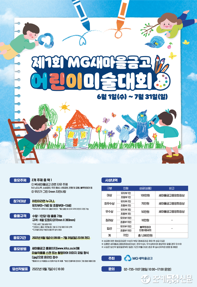(조세금융신문=최주현 기자) 새마을금고중앙회는 어린이 고객에게 새마을금고를 알리기 위해 '제1회 MG새마을금고 어린이미술대회'를 개최한다고 3일 밝혔다.