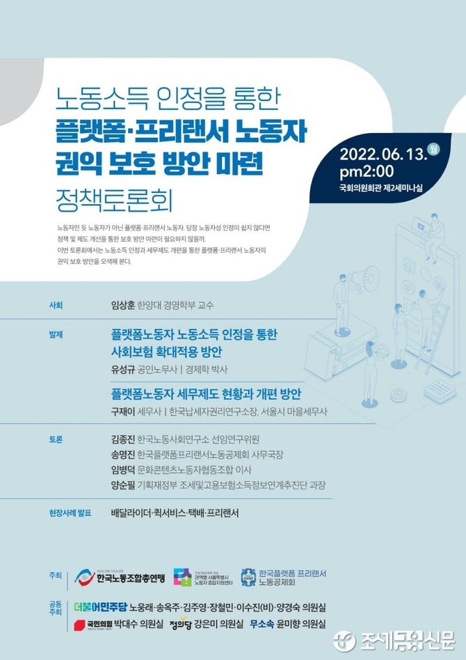 특별히 배달라이더·쿡서비스·택배·프리랜서로 일하는 현업 노동자들이 이날 토론회에 참석, 생생한 현장사례를 발표할 예정이다.