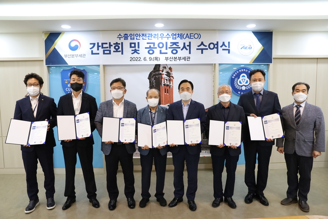 부산세관은 9일 수출입안전관리우수업체(AEO) 공인증서 수여식을 개최해 관세청의 심의를 거쳐 Mt.H콘트롤밸브㈜ 등 6개 기업에 AEO 공인증서를 수여했다고 밝혔다.