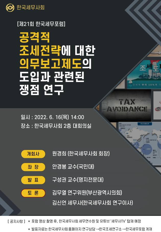 (조세금융신문=고승주 기자) 한국세무사회(회장 원경희)가 오는 16일 오후 2시 한국세무사회관 2층 대회의실에서 열리는 제21회 한국세무포럼에서 ‘공격적 조세 전략에 대한 의무보고제도의 도입과 관련된 쟁점 연구’를 주제로 세미나를 개최한다.