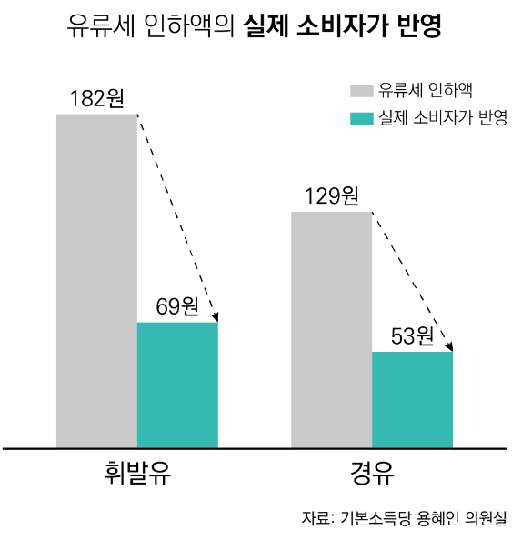 유류세 인하조치 후 6월 2주까지 리터당 두바이유 가격과 휘발유 세전공급가의 차이는 270.7원으로 직전 동기간에 비해 93.5원 올랐고, 경유는 164.0원이나 오른 것으로 나타났다.