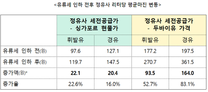 정유사가 유류세 인하 전보다 더 높은 마진을 붙여 팔고 있다고 볼 수 있는 것이다.